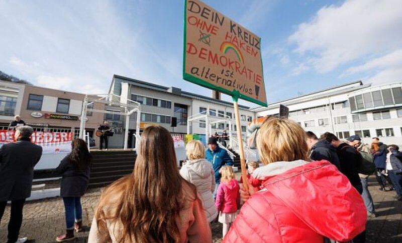Rund 200 Menschen haben unter dem Motto „Westerburg steht auf“ die Stimme erhoben. Auf dem Platz vor der Stadthalle demonstrierten sie mit bunten Plakaten für Werte wie Demokratie und Menschenwürde.